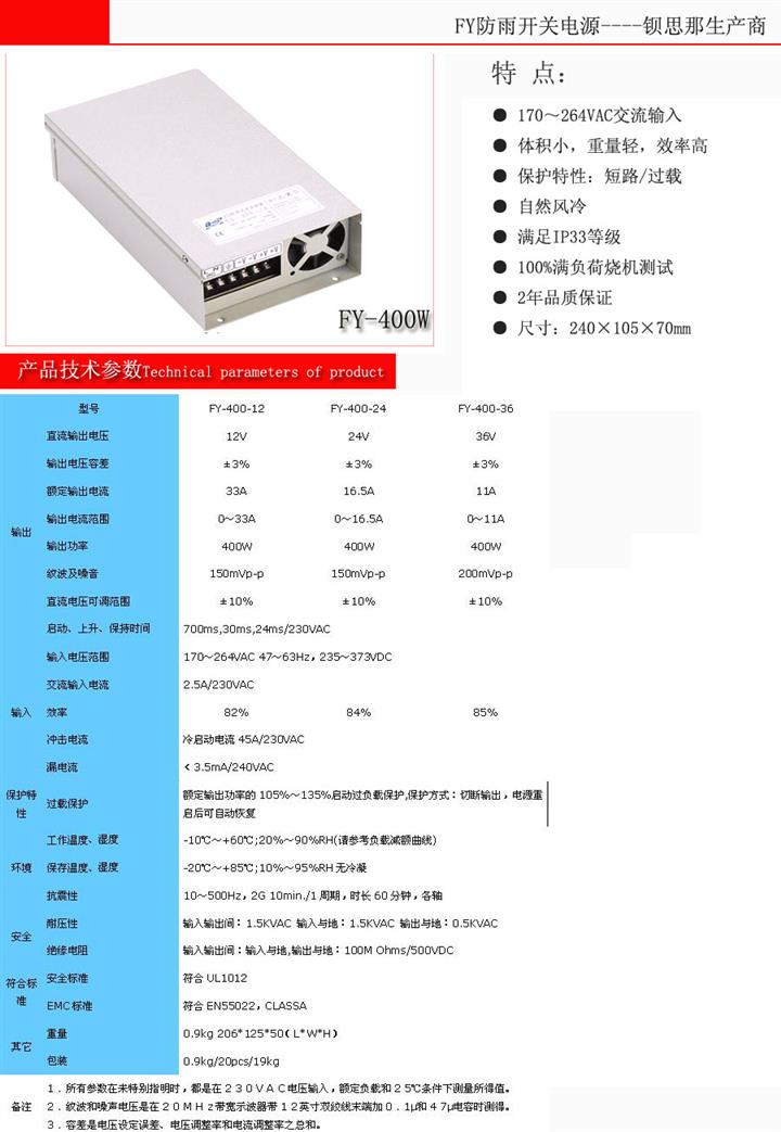产品详情:12V33A和24v16.5a两个全功率防雨开关电源是防尘的,当然不能全然防水,总功率达到400w,我们对我们的产品充满信心,因此我们有两年的保修,我们享有兼具以下优点:产品质量确实,服务不错,生产周期短。欢迎您的合作;